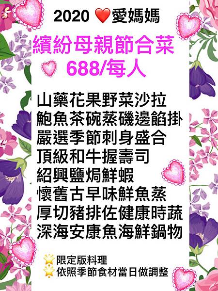 ️ 繽紛母親節合菜 (688/每人)(需預訂)